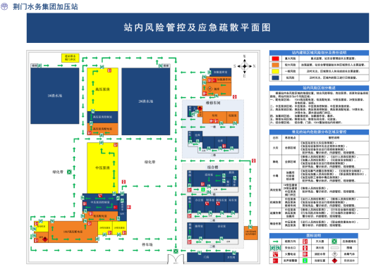 加壓站在站內(nèi)全面推行安全風(fēng)險分級管控和隱患排查治理雙重預(yù)防機(jī)制,對作業(yè)現(xiàn)場可能存在的安全風(fēng)險進(jìn)行全面識別、評估和分級,同時制作風(fēng)險四色圖和風(fēng)險告知牌,將安全風(fēng)險等級從高到低按區(qū)域依次劃分為重大、較大、一般和低風(fēng)險,分別用紅、橙、黃、藍(lán)四種顏色標(biāo)示,明確不同區(qū)域的風(fēng)險等級、防范措施和相關(guān)責(zé)任人,以最直觀的方式展示作業(yè)現(xiàn)場的安全風(fēng)險及防范措施。根據(jù)風(fēng)險四色圖和風(fēng)險告知牌外來人員能了解所處區(qū)域可能存在的風(fēng)險,做好自身防護(hù),施工人員則可以做好施工前的風(fēng)險管控,降低作業(yè)過程中的安全風(fēng)險。