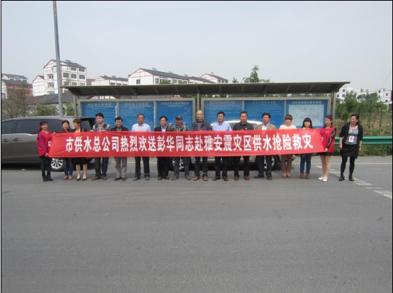 4月25日,荊門市供水總公司黨委書記陳永根,副總經(jīng)理王宜龍等一行到荊門南高速路口歡送加壓站職工彭華隨湖北紅十字會(huì)12人供水救援隊(duì)赴雅安震災(zāi)區(qū)搶險(xiǎn)救災(zāi)。出發(fā)前,該司領(lǐng)導(dǎo)囑咐彭華在災(zāi)區(qū)注意自身安全;全力以赴的撲入到搶險(xiǎn)救災(zāi)工作中去;把全體供水職工“心系雅安,你我同在”的愛心帶去。彭華表示不辜負(fù)全體員工的囑托,把愛心帶到災(zāi)區(qū),并保證圓滿完成搶險(xiǎn)救災(zāi)任務(wù)。