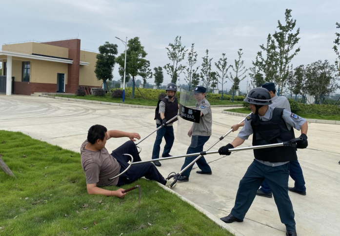 圖為安保隊(duì)長(zhǎng)演示反恐器械的正確用法