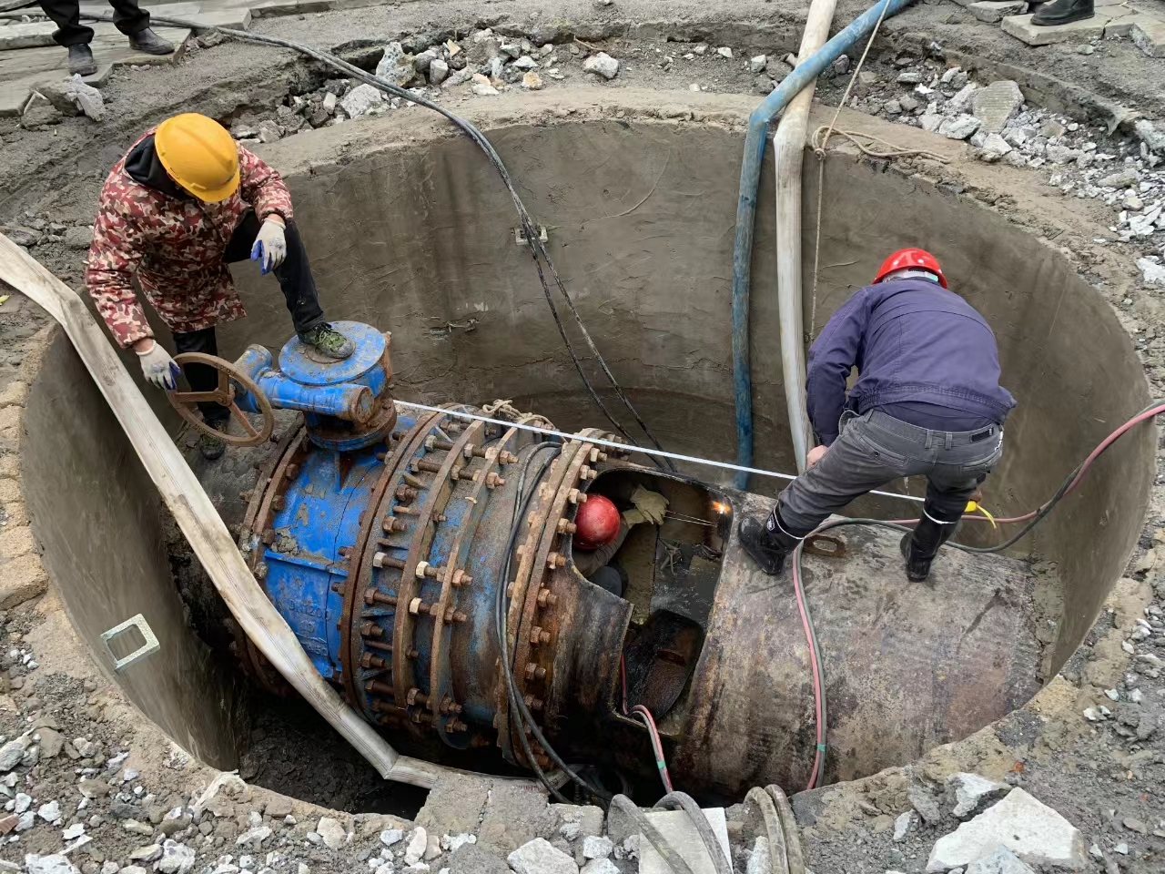 停水搶修主要包括廠站停泵、倒閥、排水、施工、沖洗、消毒、恢復(fù)供水等過程,供水管徑越大、輸水距離越長,總耗時(shí)越久。此處節(jié)點(diǎn)性閘閥為中心城區(qū)供水管網(wǎng)“大動(dòng)脈”,系主要輸水管線之一,DN1200管道的停水搶修波及范圍廣、排水時(shí)間長、焊接難度大。為全力縮短停水時(shí)間,減少停水范圍,集團(tuán)多部門聯(lián)動(dòng),最大限度保障市民生產(chǎn)生活用水。