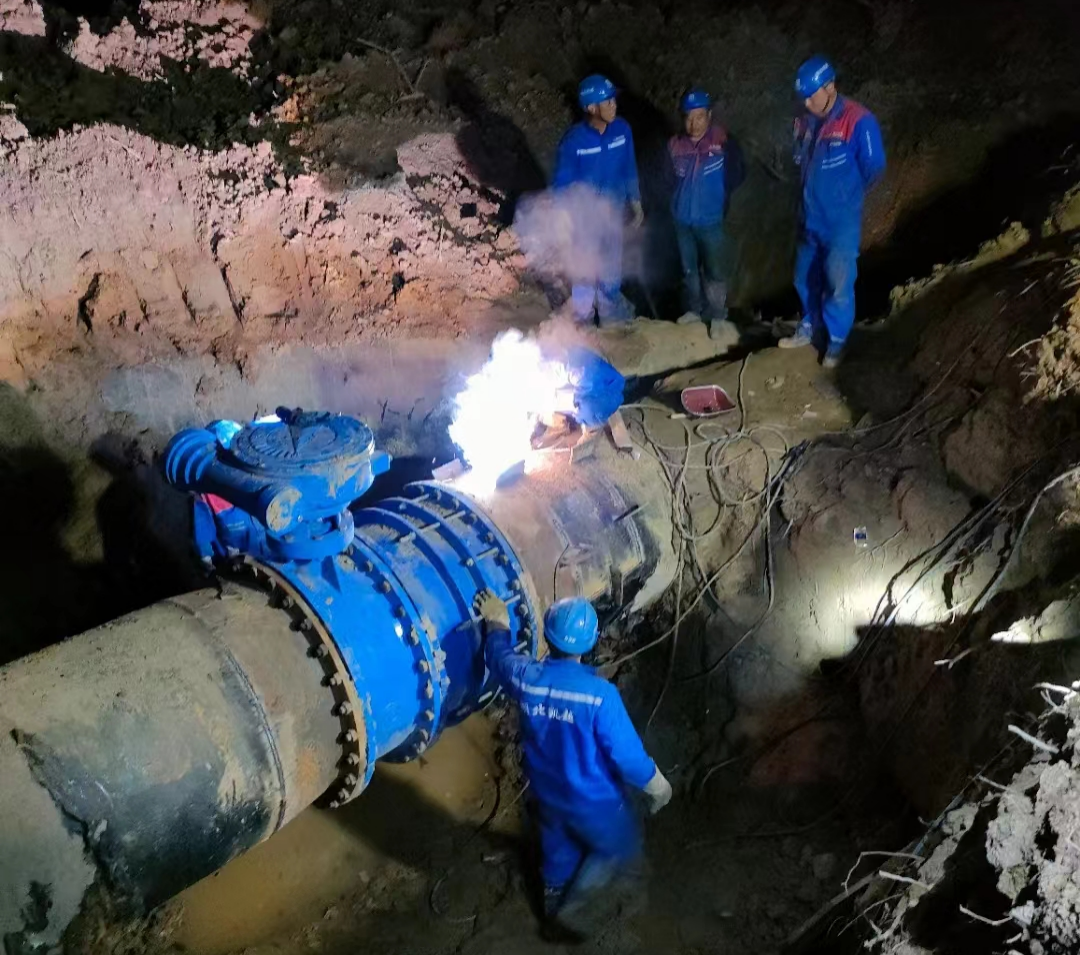 4月9日7時至次日凌晨4時,40余名工作人員陸續(xù)就位,充分調(diào)配備用原水,關(guān)閉總閘、排水、抽水、切割、焊接,施工過程一氣呵成。