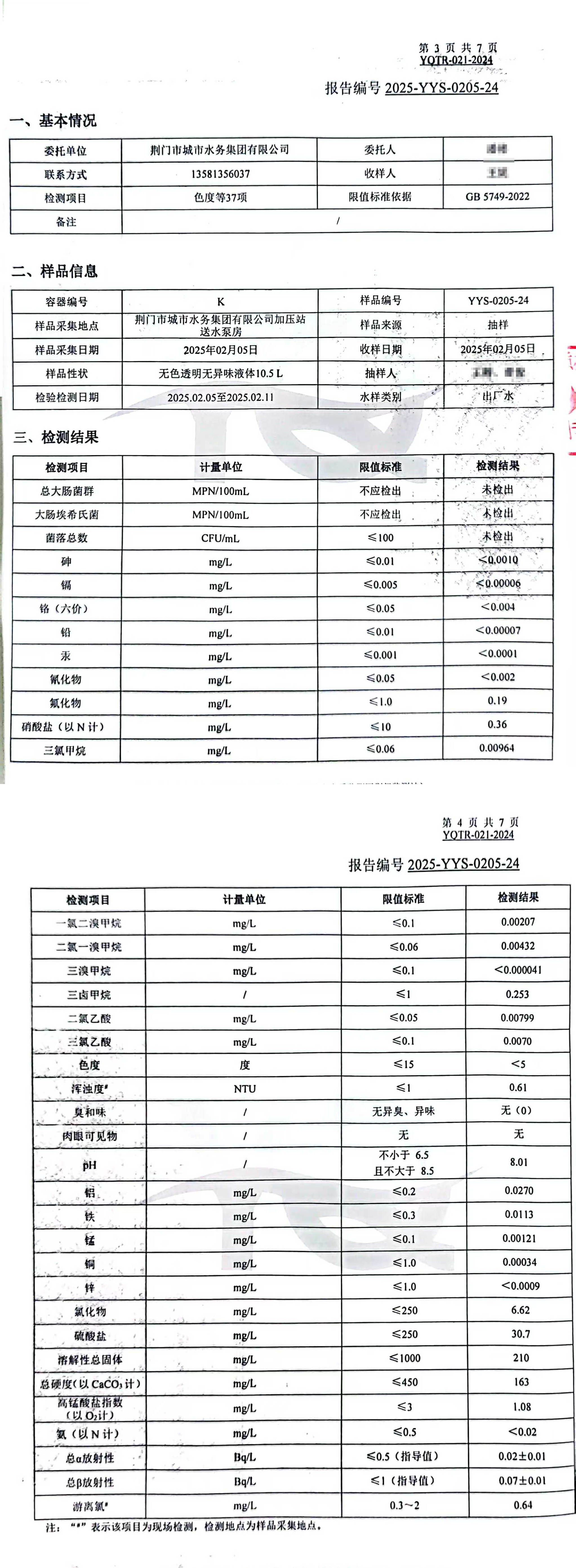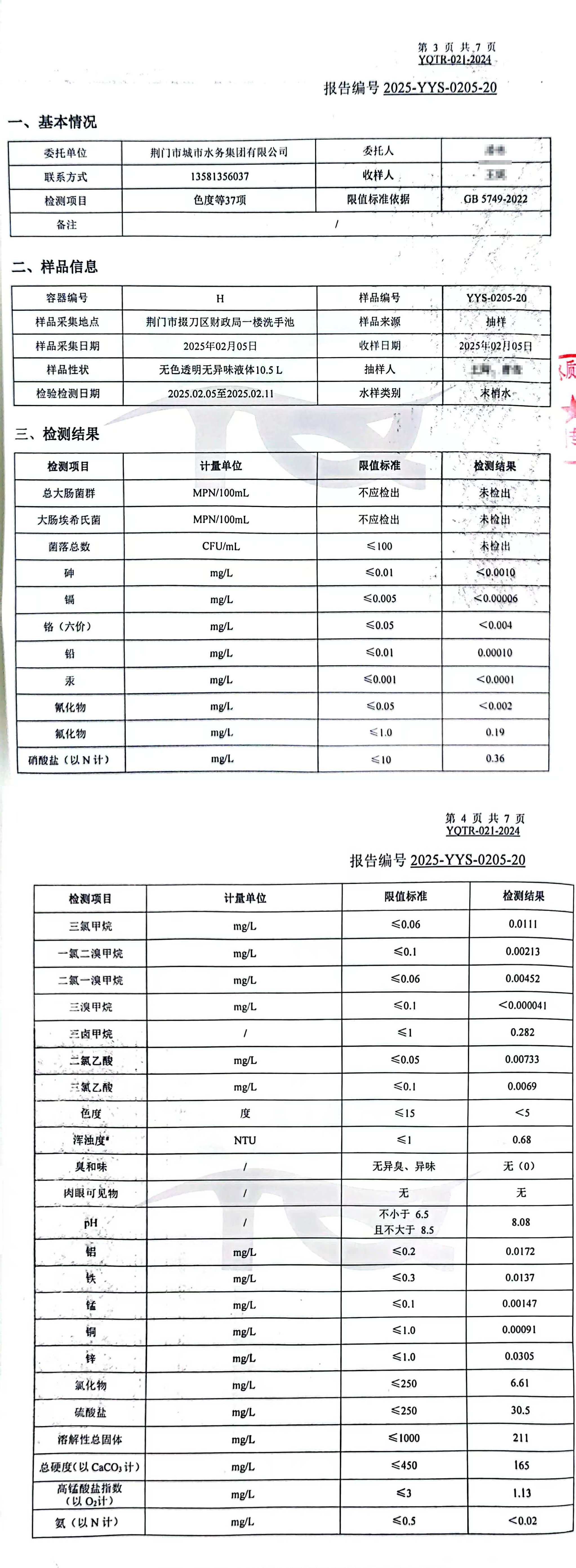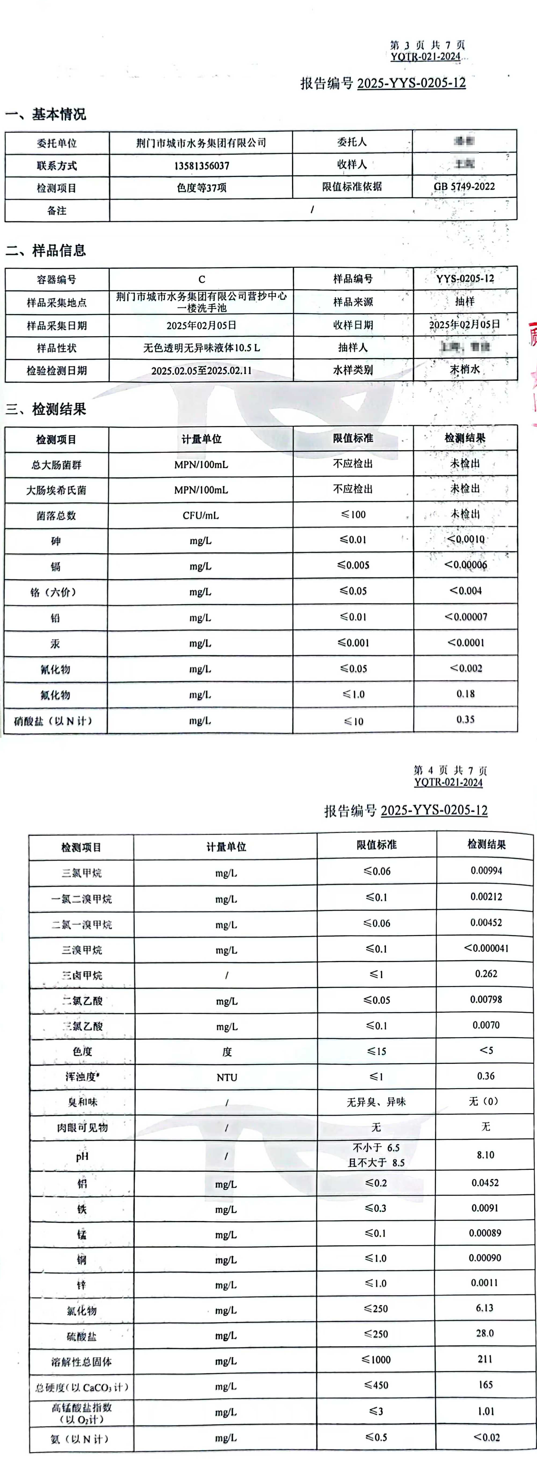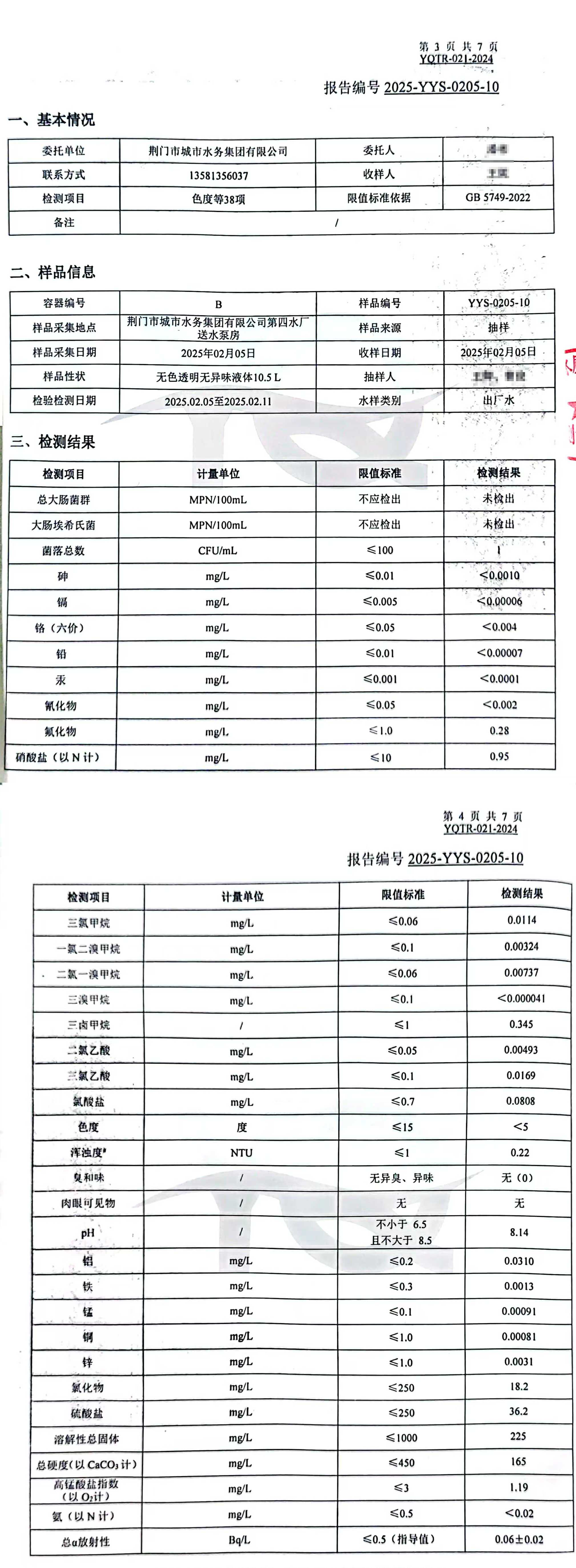 2025年2月,集團(tuán)委托具有CMA認(rèn)證資質(zhì)的第三方檢測機(jī)構(gòu),依據(jù)《生活飲用水衛(wèi)生標(biāo)準(zhǔn)》(GB5749-2022)對“四廠一站”出廠水、管網(wǎng)末梢水進(jìn)行全分析檢測,水質(zhì)合格率100%。依據(jù)《地表水環(huán)境質(zhì)量標(biāo)準(zhǔn)(GB3838-2022)》檢測漳河原水,檢測結(jié)果為符合Ⅱ類標(biāo)準(zhǔn)。