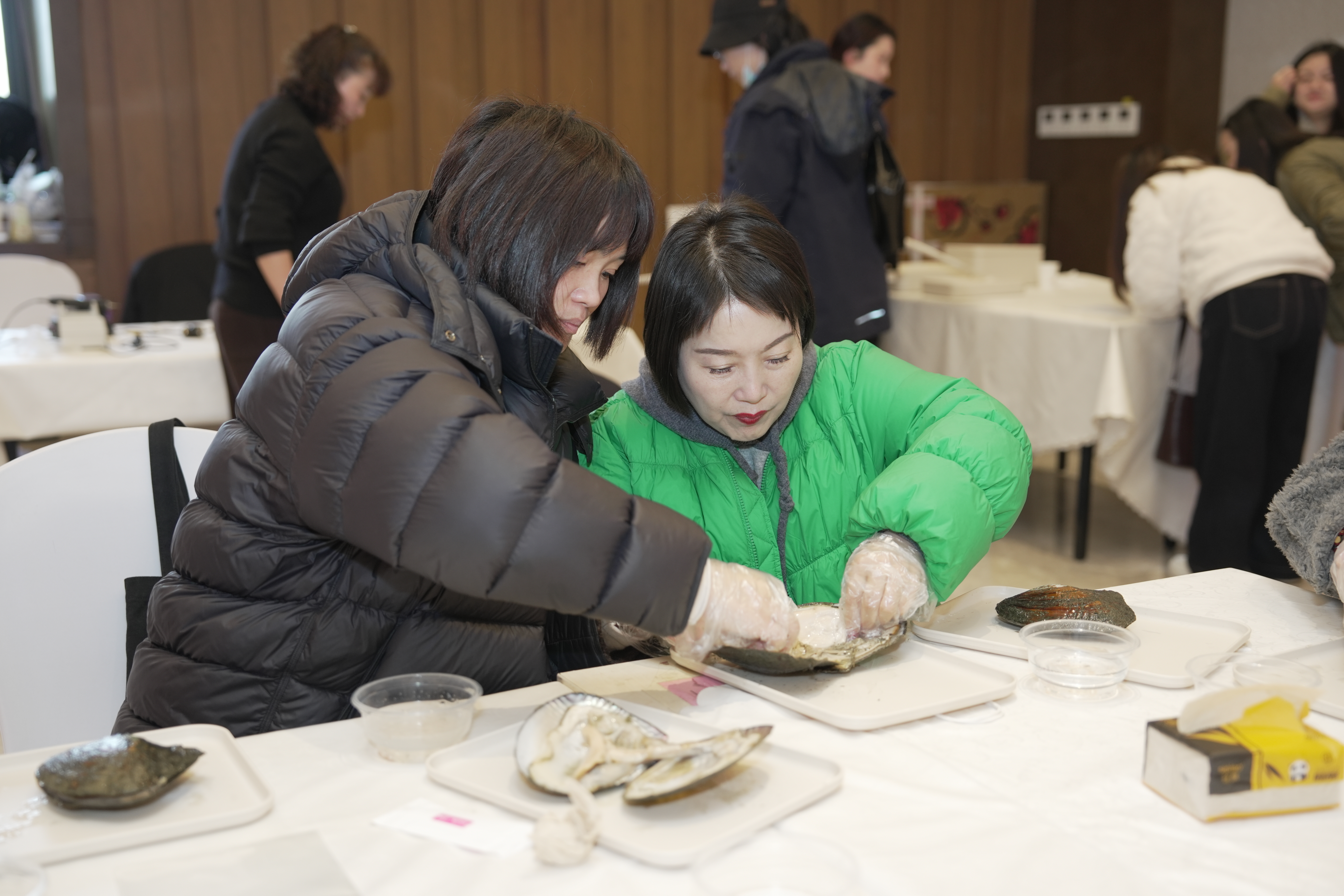 活動(dòng)開始,老師詳細(xì)講解了珍珠的形成原理、種類以及開蚌的技巧和注意事項(xiàng)。開蚌環(huán)節(jié),大家充滿驚喜與期待,戴上手套,拿起工具,探尋珍寶,大家直呼“開盲盒”的感覺真不錯(cuò)!