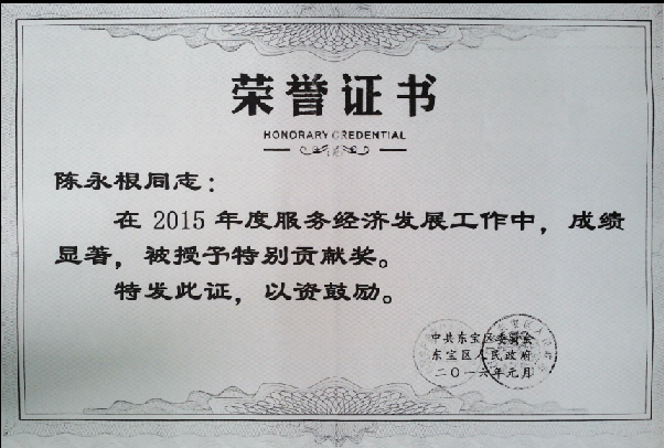 近日,公司因服務“四區(qū)兩園”成績突出,黨委書記、總經(jīng)理陳永根被東寶區(qū)委、區(qū)政府授予“服務經(jīng)濟發(fā)展工作特別貢獻獎”。