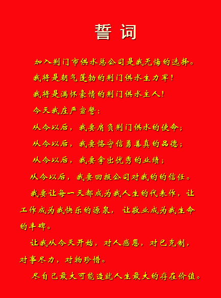 為進(jìn)一步激發(fā)供水人做好本職工作的榮譽(yù)感、使命感和責(zé)任感,11月9日下午,供水總公司在五樓會(huì)議室首次舉行新進(jìn)員工入職宣誓儀式,讓他們用誓言表達(dá)對(duì)企業(yè)、對(duì)供水職業(yè)的忠誠(chéng)。