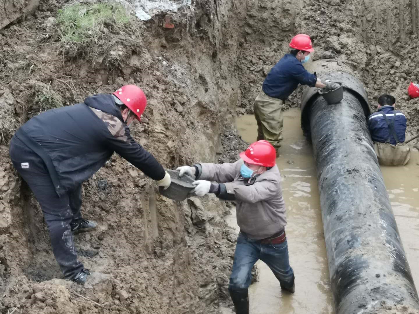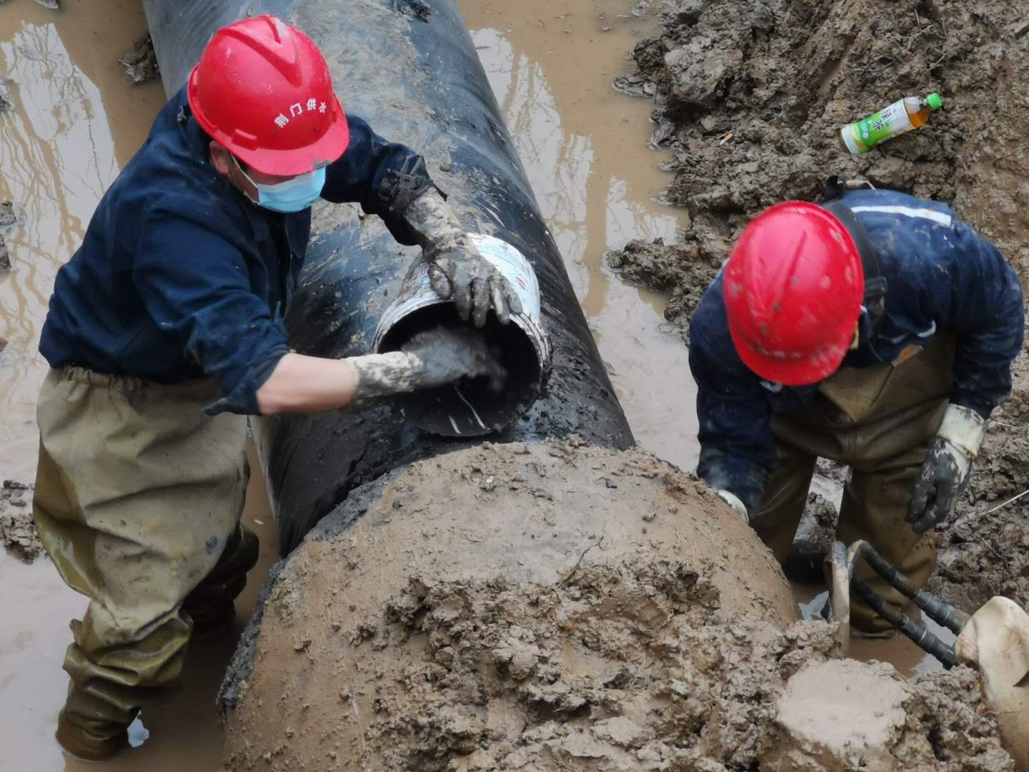 2月23日10時,掇刀區(qū)迎春大道人福藥業(yè)門前DN600mm主供水管道突發(fā)爆管,供水維修部門迅速啟動疫情期間應(yīng)急搶修預案,組織人員、工程機械、維修設(shè)備趕赴現(xiàn)場,經(jīng)過9個多小時的緊張搶修,于當日晚7點42分恢復了供水。緊接著次日8點,東寶區(qū)科陽路DN600mm主供水管道突發(fā)爆管,巡查人員現(xiàn)場核實后迅速止水,并及時通告用戶停水信息后開始倒閘排水,到13時左右開挖出爆管的DN600的主供水管道出現(xiàn)在大家面前,相比前日的搶修,整段水管因裂口較大損壞嚴重,不能簡單修復,只能現(xiàn)場立即制定可靠的管道更換維修方案。當時,全部工作人員從早上到現(xiàn)場已經(jīng)工作了5個小時,滴水未進,但大家為保障搶修進度,仍然堅持一邊加班加點對基坑進行處理,一鼓作氣將破損管道清理出來,做好對接管道的清淤工作。另一邊搬運快干水泥,切割、加工、運輸、吊裝管道,14點35分把全部材料物資運抵現(xiàn)場開始作業(yè)。隨后,大家在泥地里匆匆啃了幾口方便面后,又投入到緊張的搶修工作中,終于在18點17分完成了維修,待水泥養(yǎng)護好后,于21點27分通水,及時保障了科陽路企業(yè)和周邊居民的正常生產(chǎn)生活用水。