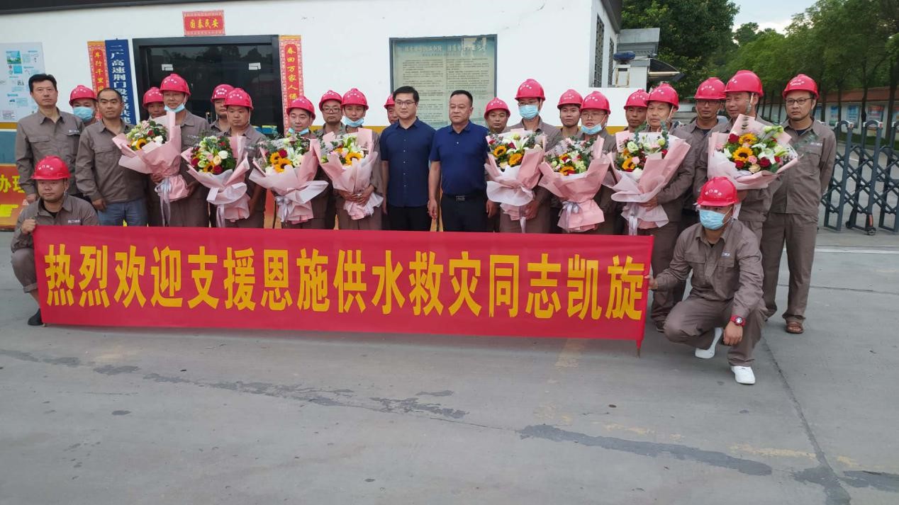 7月27日晚7時,市供水總公司逆行出征恩施市的應急供水救援隊全部平安凱旋。公司黨委委員、副總經(jīng)理曾波帶領相關負責人趕往荊門北高速公路出口迎接,獻上鮮花感謝8名隊員勇往直前,不畏艱險,圓滿完成了這次艱巨的供水救援任務。