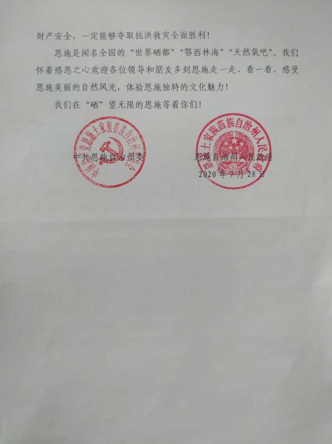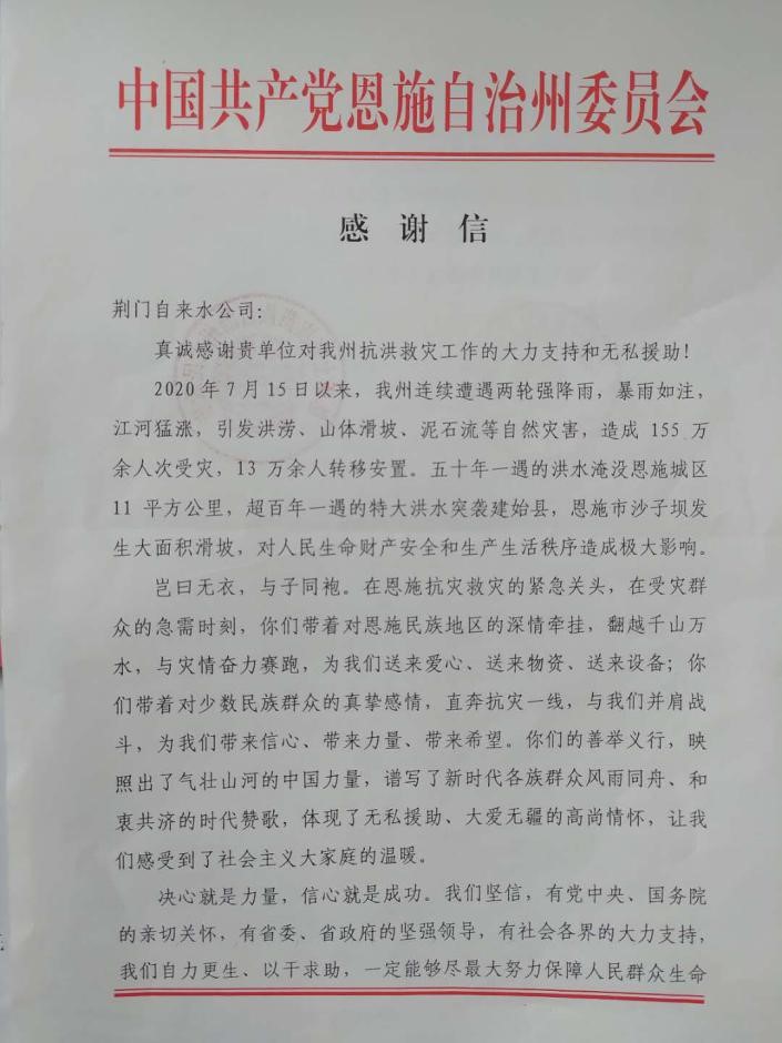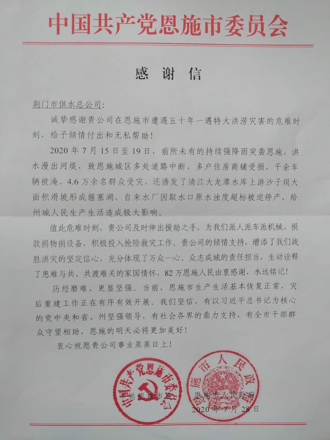 近日,恩施州委、州政府和恩施市委、市政府分別向市供水總公司發(fā)來感謝信,對(duì)該公司在恩施遭遇五十年一遇特大洪澇災(zāi)害的危難時(shí)刻給予傾情付出和無私幫助表示感謝。