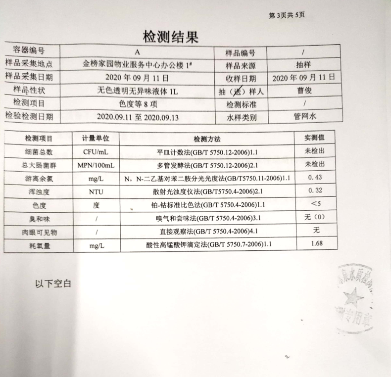 本著“用戶至上”的服務(wù)宗旨,為徹底消除用戶對(duì)荊城自來(lái)水水質(zhì)問(wèn)題的疑慮,檢測(cè)人員再次進(jìn)行現(xiàn)場(chǎng)抽樣,并將水樣送至有相關(guān)檢驗(yàn)檢測(cè)資質(zhì)的第三方檢測(cè)機(jī)構(gòu)—荊門市詠泉水質(zhì)檢測(cè)有限公司進(jìn)行檢測(cè)。檢測(cè)結(jié)果顯示該用戶家中自來(lái)水各項(xiàng)指標(biāo)均符合《生活飲用水衛(wèi)生標(biāo)準(zhǔn)》(GB5749-2006)。具體檢測(cè)項(xiàng)目及結(jié)果見(jiàn)下圖:
